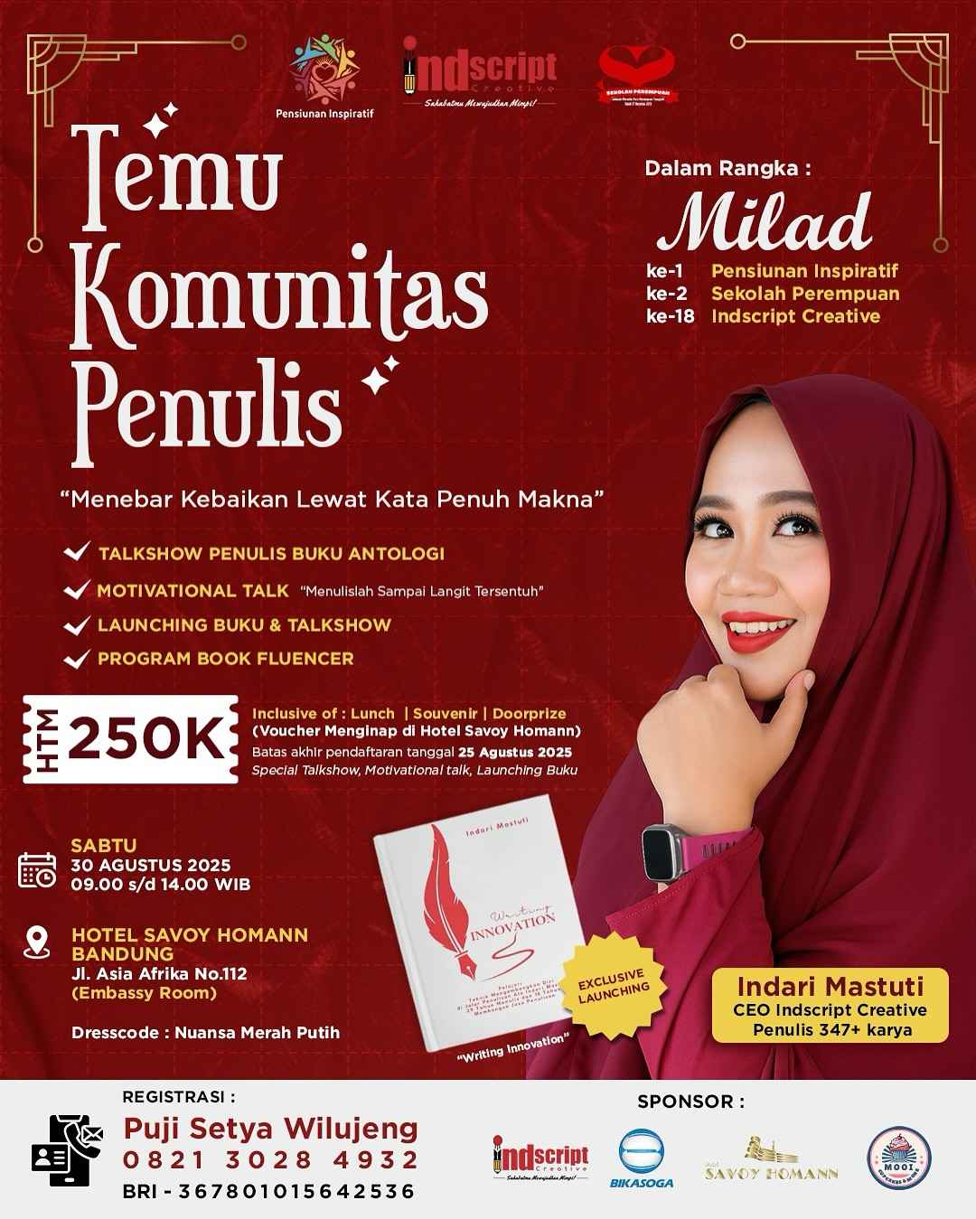 Acara yang akan diselenggarakan pada 30 Agustus 2025 di Hotel Savoy Homann Bandung ini tidak hanya menjadi ajang temu kangen, tetapi juga sarana edukasi dan pemberdayaan strategis bagi komunitas penulis, terutama dalam rangka merayakan milad ke-1 Pensiunan Inspiratif, milad ke-2 Sekolah Perempuan, dan milad ke-18 Indscript Creative.