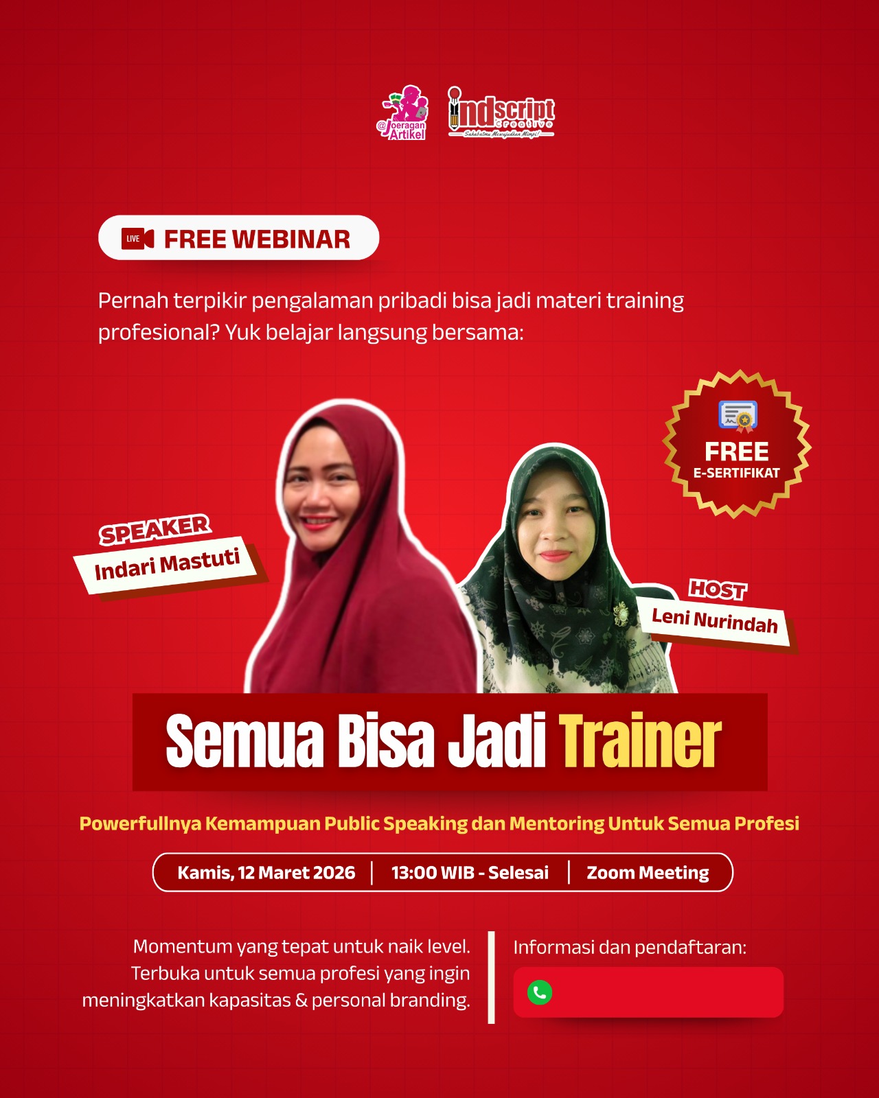 Webinar “Semua Bisa Jadi Trainer: Powefullnya Kemampuan Public Speaking dan Mentoring untuk Semua Profesi”, yang diselenggarakan oleh Indscript Creative pada Kamis, 12 Maret 2026 menjadi salah satu ruang belajar bagi masyarakat yang ingin memahami bagaimana pengalaman pribadi dapat berkembang menjadi materi training profesional.